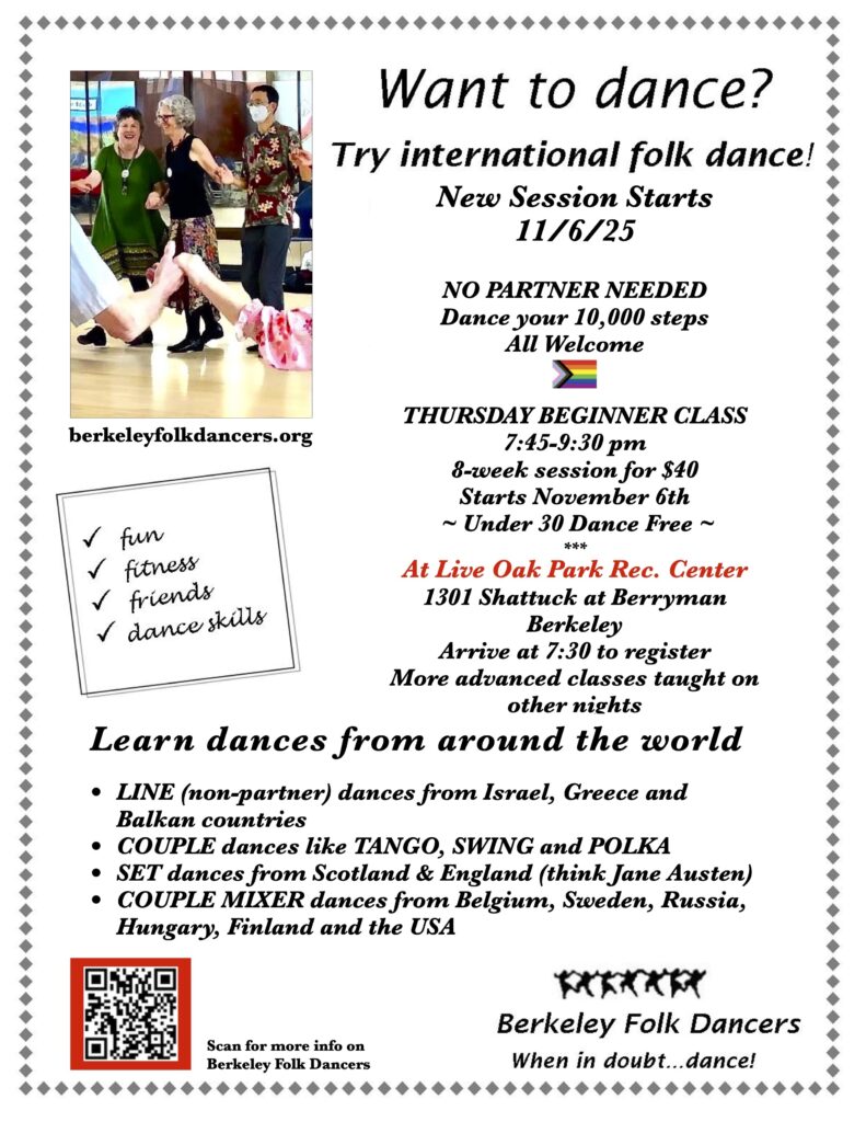 - Thursday evenings,(poster on the right) 7:45-9:30, at Live Oak Hall, 1301 Shattuck, Berkeley. Teachers: Marian Snyder assisted by Cornelia Ghafur. Covers the entire Berkeley Folk Dancer beginner repertoire between September and the following August, which is the ideal preparation for eventually moving up to higher-level BFD classes. Offers two $40 8-week sessions for newcomers, starting the first week in September, so you don’t have to pay annual dues or $8/session until January. You may take this class for up to two years.