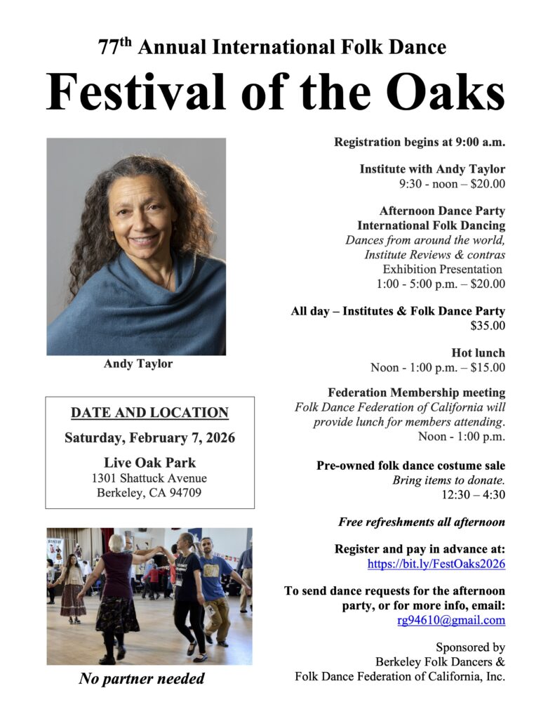 February 8, Saturday Festival of the Oaks Dancing Institute 9:30-12 Dancing 1-5pm Set Up Friday Feb 7 @ 5pm NC